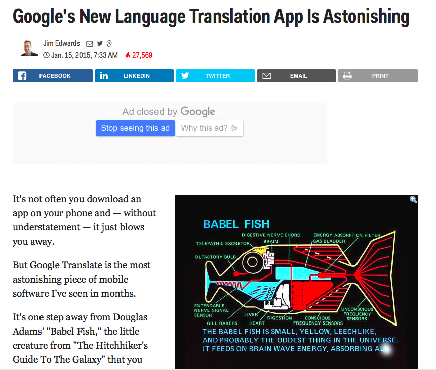 Adams’s futuristic universe contains the Babel fish – a fish that can translate any language. Through various quotes from the narrator and events in the text, it is clear Adams is not too keen on the idea.