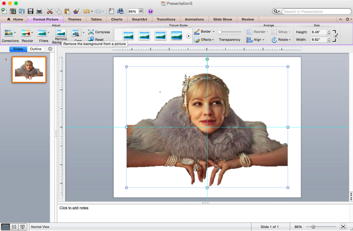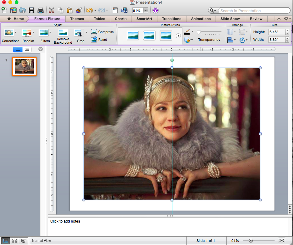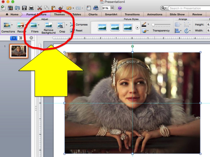 This is Daisy Buchanan with a lot going on in the background. I want the students to focus only on Daisy and I think it’s more ascetically pleasing without the background noise. So, I’m going to use the icon, in the top left, called Remove Background to isolate Daisy.