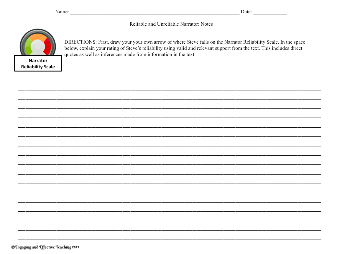This is part of my lesson for Monster (mentioned in this previous post and available at my TpT store here). Sometimes it’s not so cut and try the degree to which we trust the narrator. Monster is a great example of this. Using a scale of reliable to not reliable students need to take into account different character traits, actions, and thoughts in order to determine the overall reliability of the narrator.
